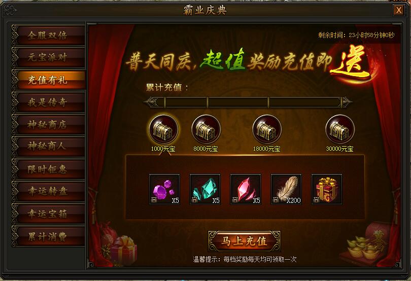 活动期间,充值元宝即可领取四档丰厚奖励,每天均可领取一次,不容错过!