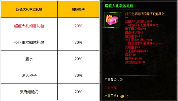 ②超值大礼幸运礼包(打开可随机获得其中之一:超值大礼如意礼包*1、公正墨水如意礼包*1、露水*40、、晴天种子*30、灵宠经验丹*30);