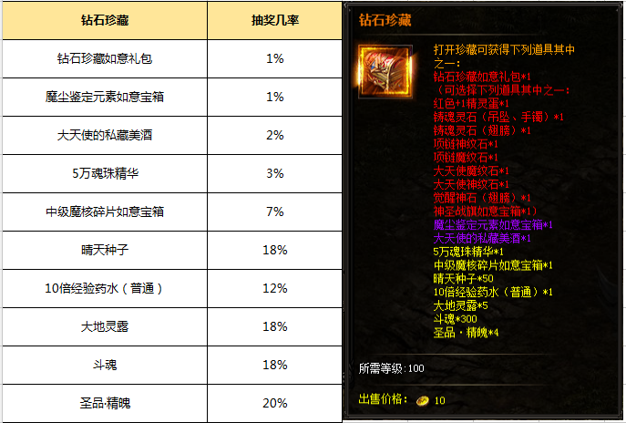 (3)打开钻石珍藏需消耗一个星辰能量石,并获得100活动积分;钻石珍藏打开有几率获得:变异海魔兽魂*1、贤者之书*1、红色+1精灵蛋*1、铸魂灵石(翅膀)*1、铸魂灵石(吊坠、手镯)*1、项链魔纹石*1、项链神纹石*1、大天使魔纹石*1、大天使神纹石*1、觉醒神石(吊坠、手镯)*1、魔尘元素如意宝箱*1、高级魔核碎片如意宝箱*1等。