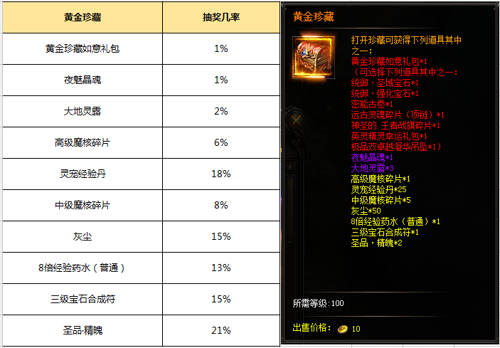 (2)打开黄金珍藏需消耗一个纯净能量石,并获得50活动积分;黄金珍藏打开有几率获得:统御·圣域宝石*1、统御·强化宝石*1、密能古卷*1、远古灵魂碎片(项链)*1、神圣的王者战旗碎片*1、英灵精灵幸运礼包*1、极品双卓越凝华吊坠*1、夜魅晶魂*1、大地灵露*3、高级魔核碎片*1等。