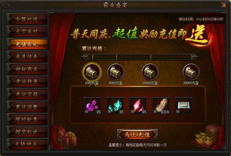 活动期间,充值元宝即可领取四档丰厚奖励,每天均可领取一次,不容错过!