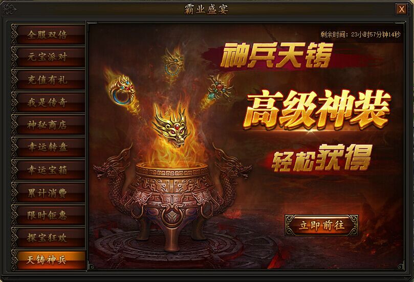 活动期间,天铸神兵限时出现在比奇城,投入低级神装,花费少量元宝即有机会获得更高级神装,从此快人一步,集齐高阶神装不是梦!