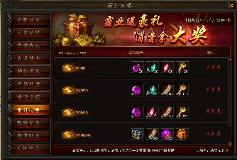活动期间,累计消费一定数量元宝,即可领取对应档奖励,每个角色只能领取一次。
