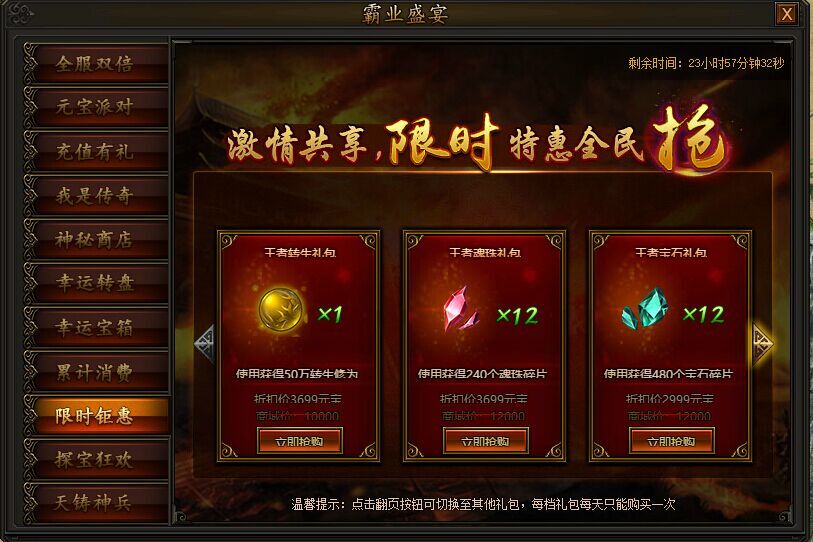 活动期间,每两小时神秘商店会自动刷新一批道具,也可花费元宝立即刷新,大量道具限时等你抢购。