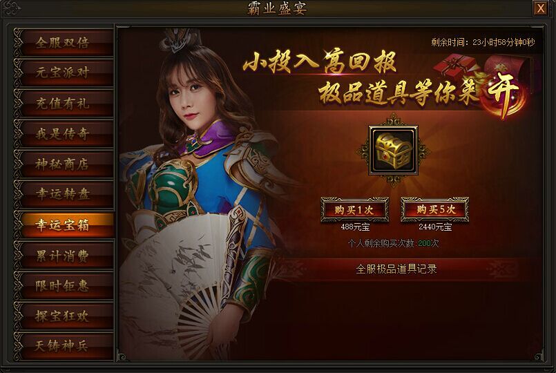 活动期间,80级以上(包含80级)玩家每天最多可购买500次,打开幸运宝箱可随机获得一种道具,多买多得,极品道具等你来开!