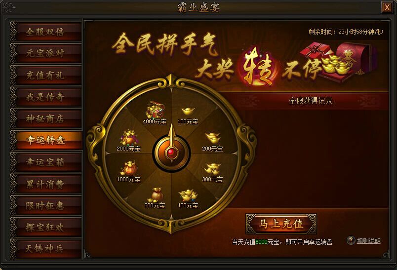 活动期间,充值并消费一定元宝即可使用幸运转盘,获得大量元宝道具,使用获得元宝后即可前往商城内购买珍稀道具,精彩不容错过。