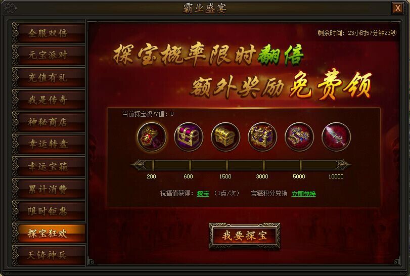 探宝超值回馈限时开启!活动期间探宝可获得祝福值,祝福值达到一定数值即可领取霸业装备奖励!