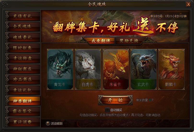 活动期间,充值可获得翻牌机会,抽取卡片,集齐各类卡牌,可组合兑换不同档次的奖励。
