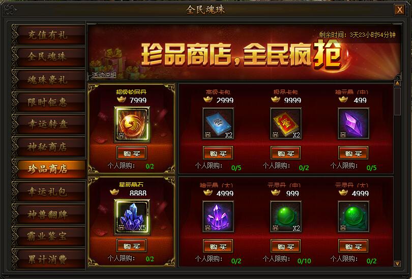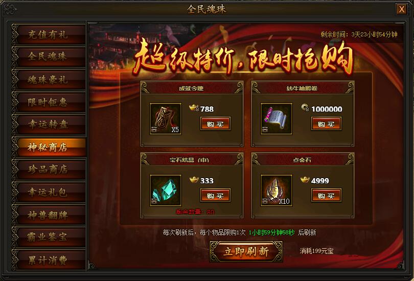 活动期间,每两小时神秘商店会自动刷新一批道具,也可花费元宝立即刷新,大量道具限时等你抢购,数量有限,先买先得。