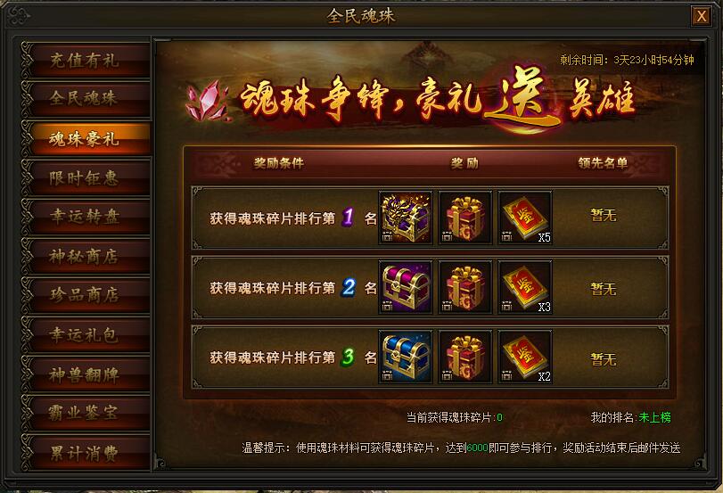 活动期间,使用魂珠碎片大、中、小材料获得魂珠碎片,获得碎片数目达到6000即可参与碎片获得排行,有机会获得霸业装备、极品首饰奖励!活动结束后,奖励通过邮件发送。