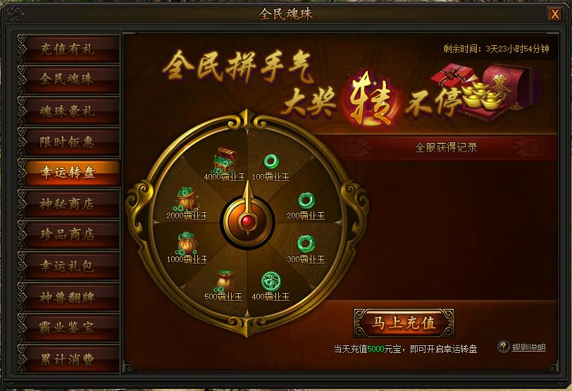 活动期间,充值并消费一定元宝即可使用幸运转盘,获得大量霸业玉道具,使用霸业玉后即可前往霸业商城内购买珍稀道具,精彩不容错过。