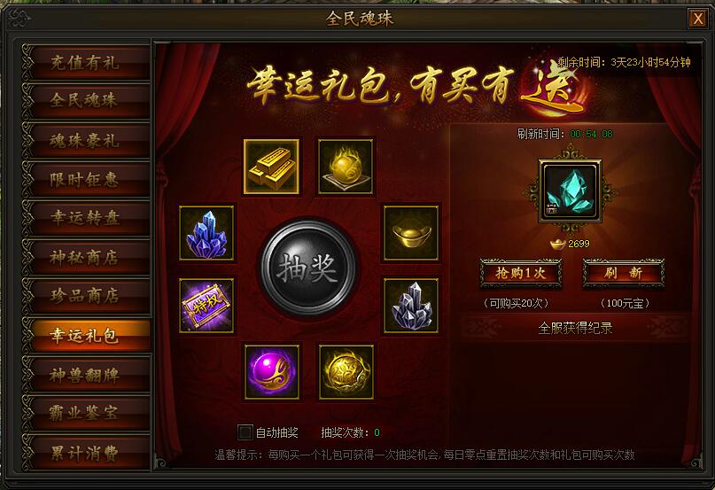 活动期间,每购买一次礼包可获得一次抽奖机会,还可花费元宝进行刷新!抽奖次数和礼包购买次数每日零点清零,请及时抽奖。