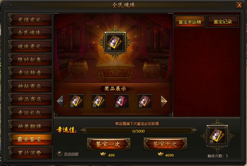 活动期间,花费一定数量元宝即可进行霸业鉴宝,每次鉴宝均可获得祝福值,祝福值满后下一次鉴宝必出极品大奖,数量有限,不容错过。