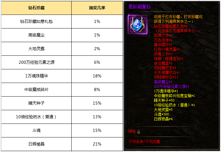 (3)打开钻石珍藏需消耗一个星辰能量石,并获得100活动积分;钻石珍藏打开有几率获得:战神之矛*1、万古法球*1、晶华圆环*1、红色+1精灵蛋*1、贤者之书*1、统御·噬魂宝石*1、命运魔盒*1、项链魔纹石*1、大天使魔纹石*1、项链神纹石*1、200万经验元素之源*1、高级魔尘*1等。