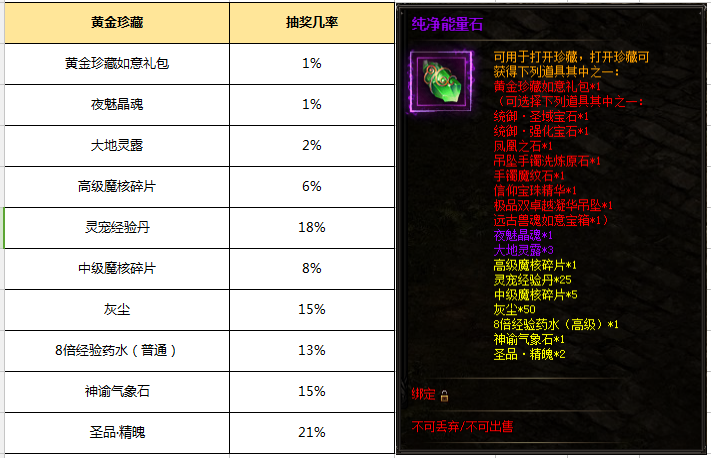 (2)打开黄金珍藏需消耗一个纯净能量石,并获得50活动积分;黄金珍藏打开有几率获得:统御·圣域宝石*1、统御·强化宝石*1、凤凰之石*1、吊坠手镯洗炼原石*1、手镯魔纹石*1、信仰宝珠精华*1、极品双卓越凝华吊坠*1、远古兽魂如意宝箱*1夜魅晶魂*1、大地灵露*3、高级魔核碎片*1等。