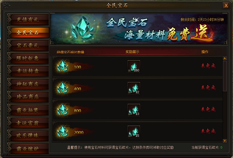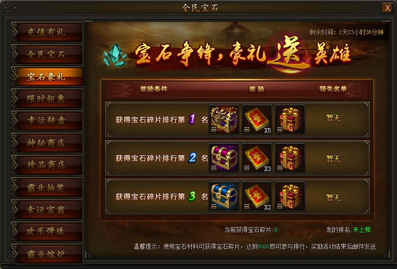 活动期间,使用宝石结晶大、中、小材料获得宝石碎片,获得碎片数目达到8000即可参与碎片获得排行,有机会获得极品奖励!活动结束后,奖励通过邮件发送。