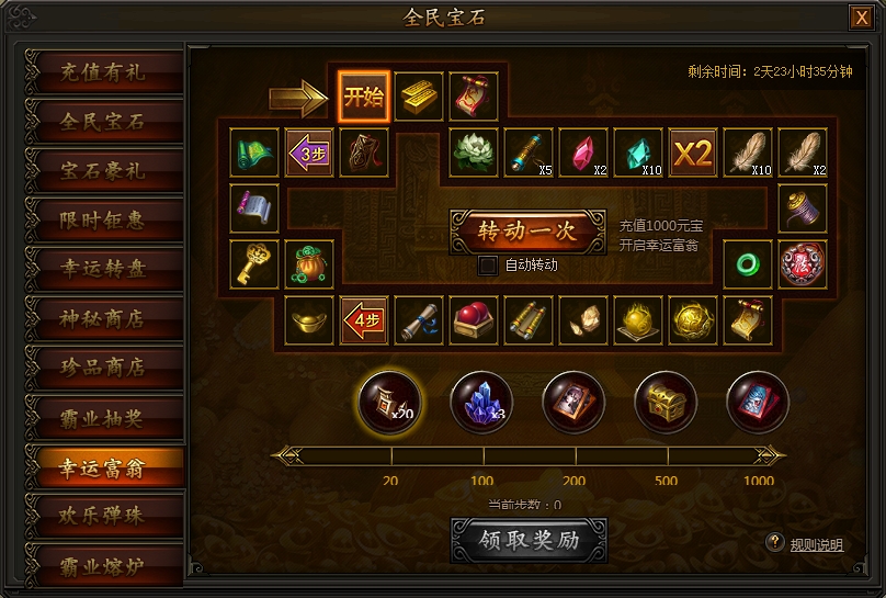 活动期间,充值一定元宝即可参与幸运大富翁,获得丢骰子次数,转动骰子即可获得踩中格子上的豪华奖励,多次参与累计步数,更有机会得到时装宝箱和极品转生装备奖励!