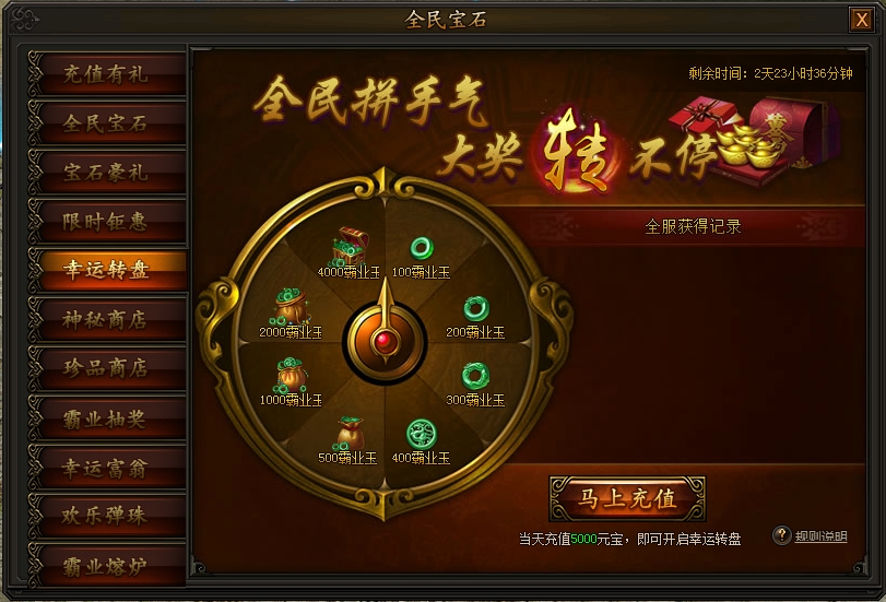活动期间,充值并消费一定元宝即可使用幸运转盘,获得大量霸业玉道具,使用霸业玉后即可前往霸业商城内购买珍稀道具,精彩不容错过。