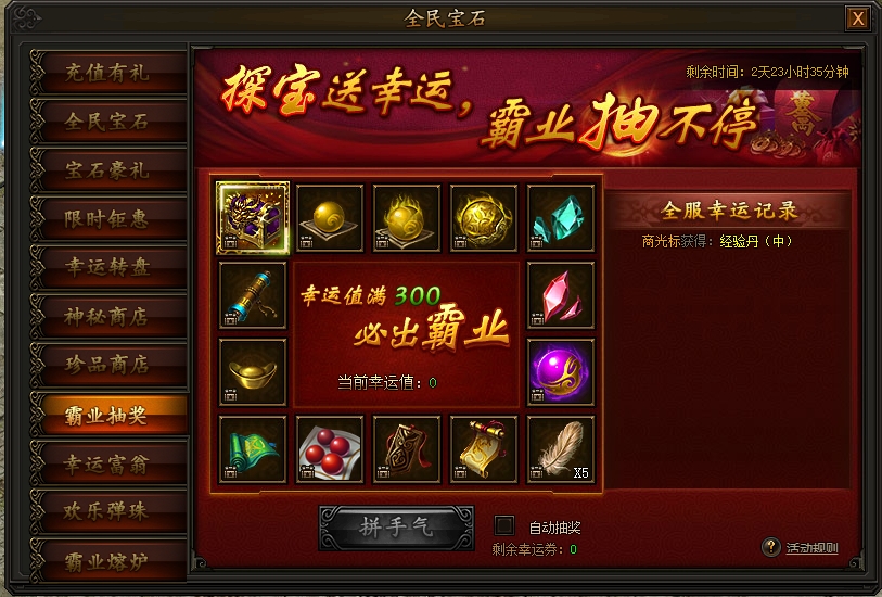 活动期间每探宝十次即送一张幸运券,可用于参与霸业抽奖,有机会获得海量材料和霸业装备!每次抽奖即可获得一点幸运值,幸运值达到300点抽奖必出霸业装备箱!