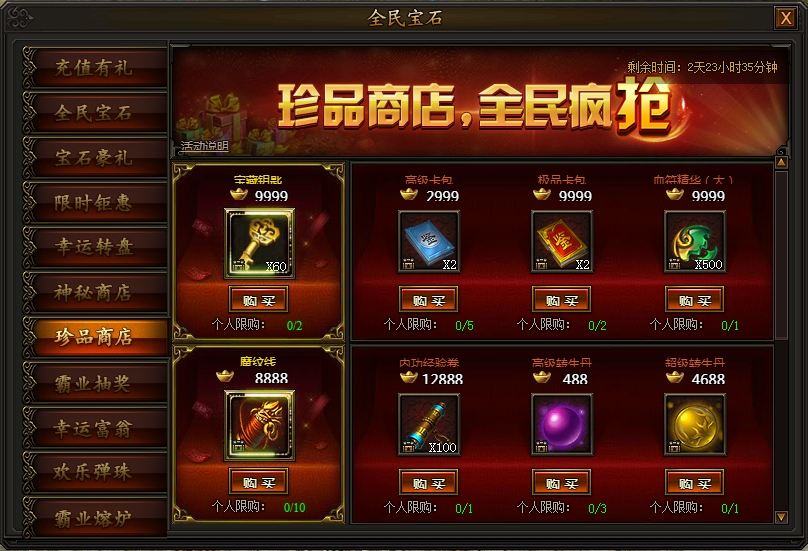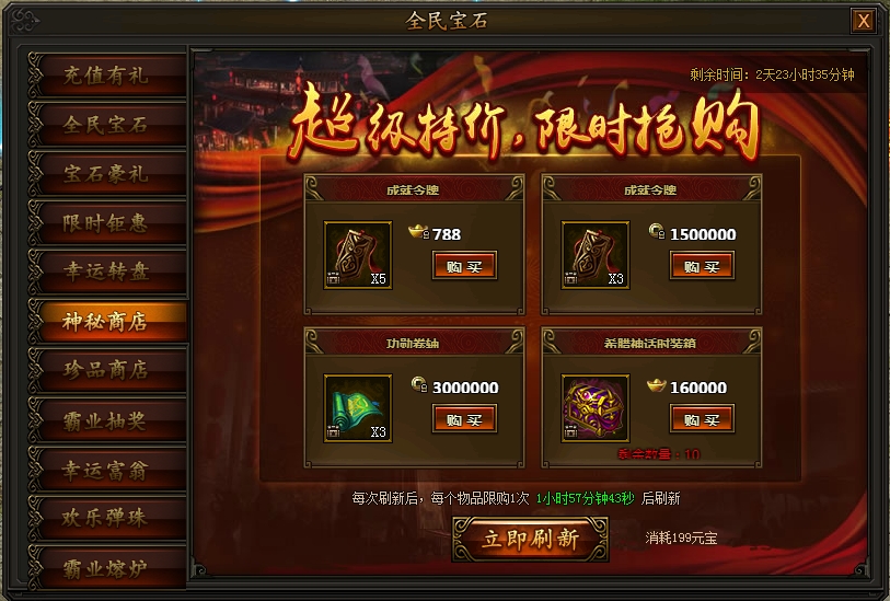 活动期间,每两小时神秘商店会自动刷新一批道具,也可花费元宝立即刷新,大量道具限时等你抢购,数量有限,先买先得。