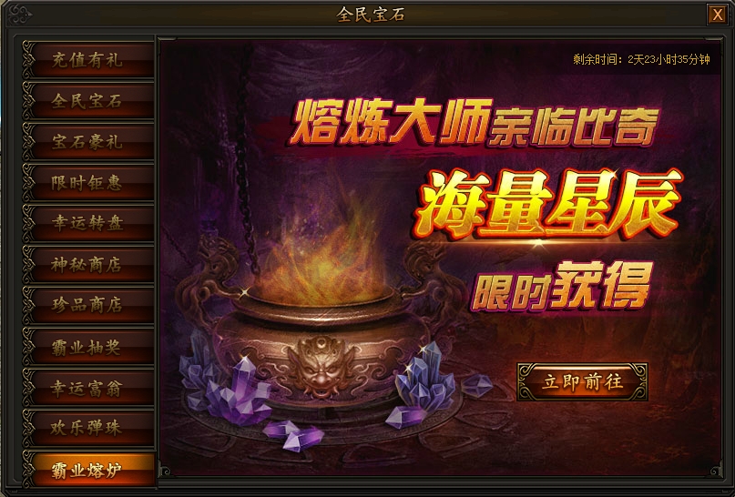 活动期间,熔炼大师出现在比奇城,熔炼5转及以上转升装备,百分百获得星辰晶石,机会难得不容错过,开服15天及以上的区服所有玩家才可参与。