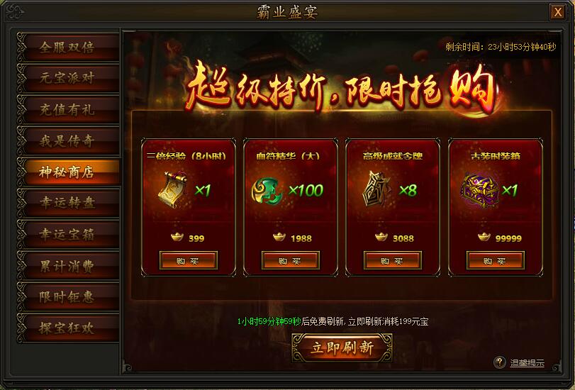活动期间,每两小时神秘商店会自动刷新一批道具,也可花费元宝立即刷新,大量道具限时等你抢购。