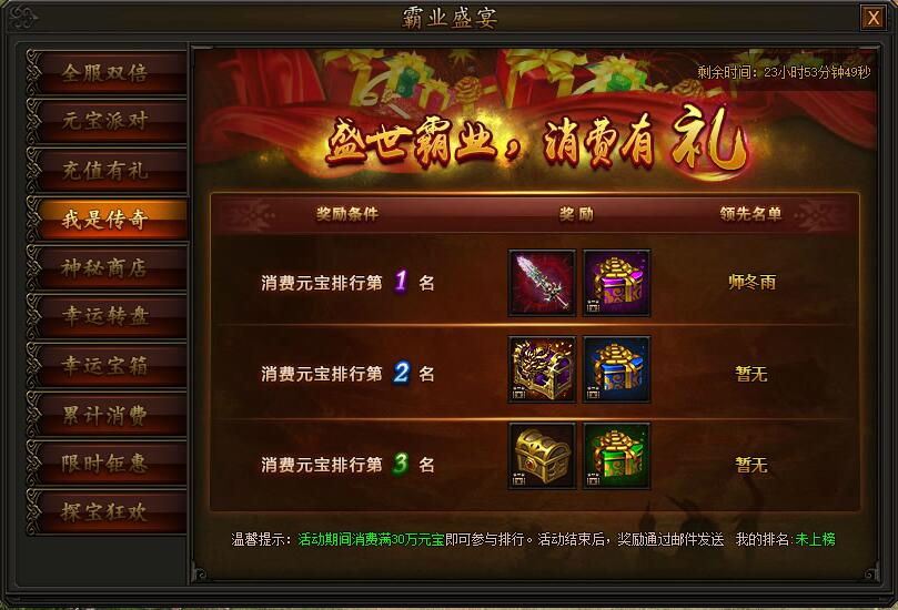 活动期间,累计消费满30w元宝即可参与排行,排行前3名即可获得霸业以及高级转生装备,豪礼不容错过。