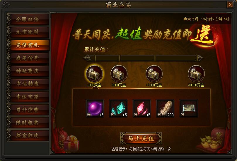 活动期间,充值元宝即可领取四档丰厚奖励,每天均可领取一次,不容错过!