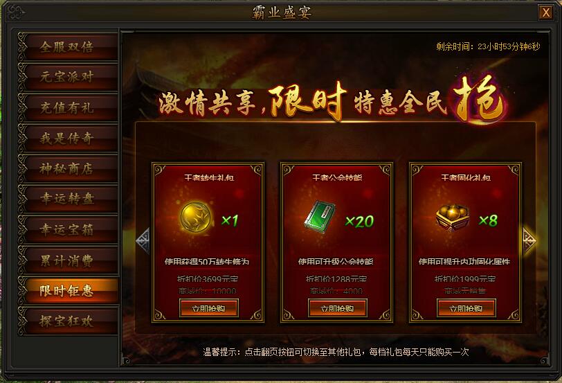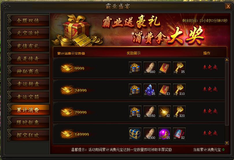 活动期间,累计消费一定数量元宝,即可领取对应档奖励,每个角色只能领取一次。