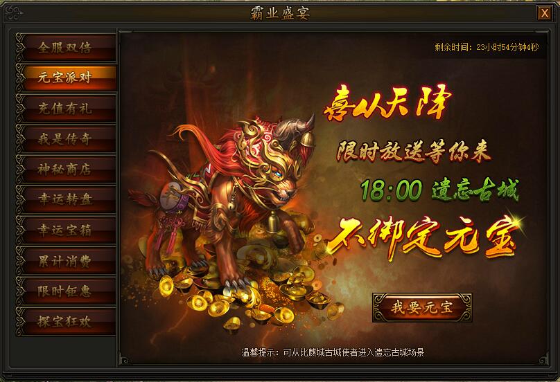 活动期间下午18:00,可通过比奇城古城使者NPC处进入遗忘古城,击杀boss后掉落不绑定元宝,掉落物品无归属。