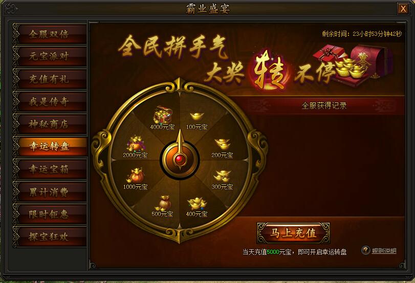 活动期间,充值并消费一定元宝即可使用幸运转盘,获得大量元宝道具,使用获得元宝后即可前往商城内购买珍稀道具,精彩不容错过。