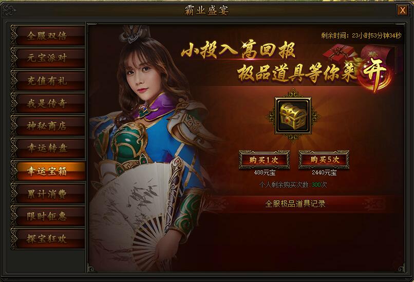 活动期间,80级以上(包含80级)玩家每天最多可购买300次,打开幸运宝箱可随机获得一种道具,多买多得,极品道具等你来开!