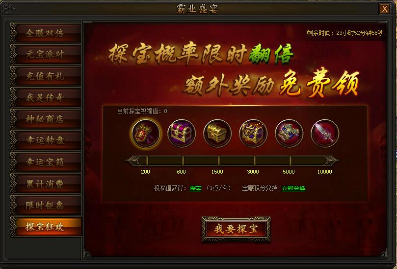 探宝超值回馈限时开启!活动期间探宝可获得祝福值,祝福值达到一定数值即可领取霸业装备奖励!
