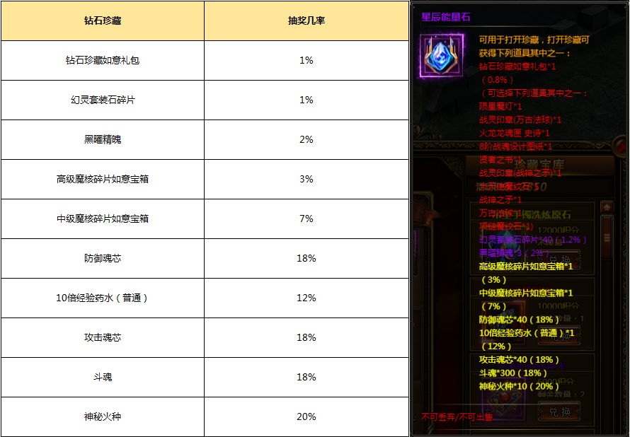 (3)打开钻石珍藏需消耗一个星辰能量石,并获得100活动积分;钻石珍藏打开有几率获得:钻石珍藏如意礼包*1、幻灵套装石碎片*40、黑曜精魄*3、高级魔核碎片如意宝箱*1、中级魔核碎片如意宝箱*1、防御魂芯*40、10倍经验药水(普通)*1、攻击魂芯*40、斗魂*300、神秘火种*10等。