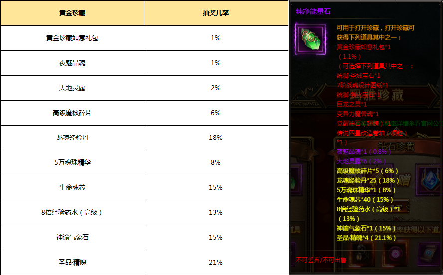 (2)打开黄金珍藏需消耗一个纯净能量石,并获得50活动积分;黄金珍藏打开有几率获得:黄金珍藏如意礼包*1、夜魅魔晶*1、大地灵露*6、高级魔核碎片*5、龙魂经验丹*25、5万魂珠精华*1、生命魂芯*40、8倍经验药水(高级)*40、神谕气象石*1、圣品·精魄*4等。