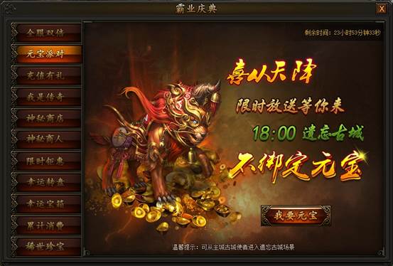 活动期间下午18:00,可通过比奇城古城使者NPC处进入遗忘古城,击杀boss后掉落不绑定元宝,掉落物品无归属。