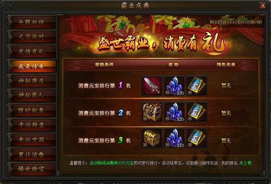 活动期间,累计消费满30w元宝即可参与排行,排行前3名即可获得霸业以及高级转生装备,豪礼不容错过。