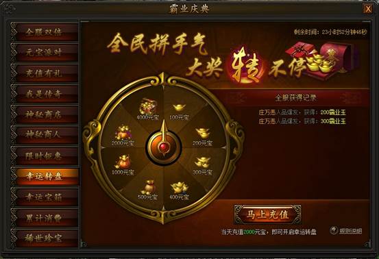 活动期间,充值并消费一定元宝即可使用幸运转盘,获得大量元宝道具,使用后即可获得大量元宝,精彩不容错过。