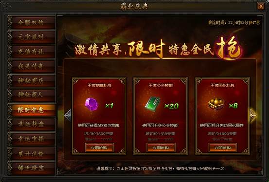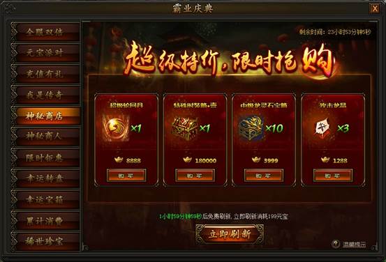 活动期间,每两小时神秘商店会自动刷新一批道具,也可花费元宝立即刷新,大量道具限时等你抢购。
