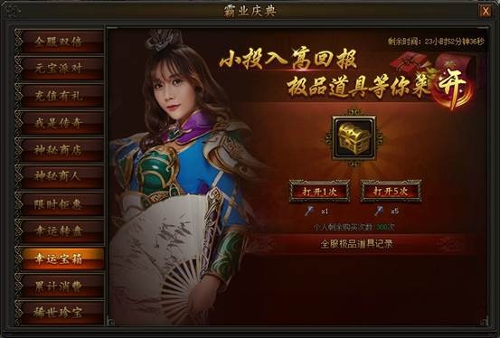 活动期间,80级以上(包含80级)玩家每天最多可打开300次,打开幸运宝箱可随机获得一种道具,多买多得,极品道具等你来开!钥匙可从稀世珍宝中购买经验丹赠送!