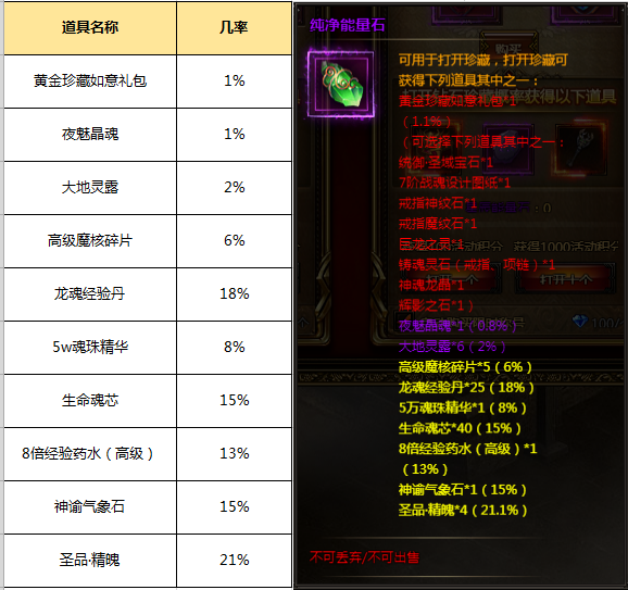 (2)打开黄金珍藏需消耗一个纯净能量石,并获得50活动积分;黄金珍藏打开有几率获得:黄金珍藏如意礼包*1、夜魅魔晶*1、大地灵露*6、高级魔核碎片*5、龙魂经验丹*25、5万魂珠精华*1、生命魂芯*40、8倍经验药水(高级)*40、神谕气象石*1、圣品·精魄*4等。