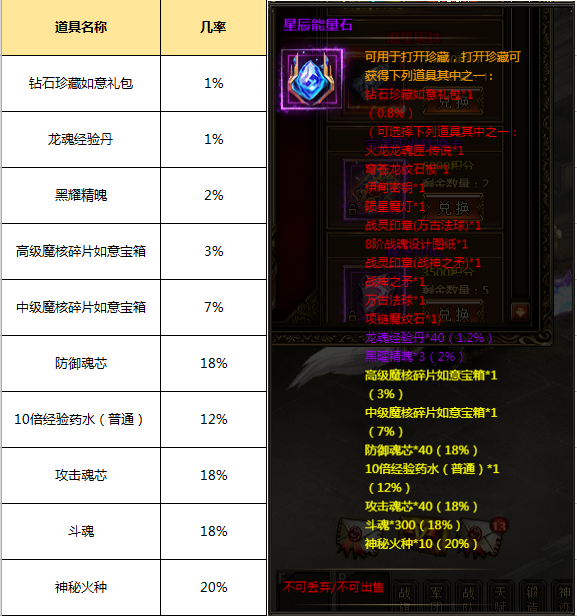 (3)打开钻石珍藏需消耗一个星辰能量石,并获得100活动积分;钻石珍藏打开有几率获得:钻石珍藏如意礼包*1、幻灵套装石碎片*40、黑曜精魄*3、高级魔核碎片如意宝箱*1、中级魔核碎片如意宝箱*1、防御魂芯*40、10倍经验药水(普通)*1、攻击魂芯*40、斗魂*300、神秘火种*10等。
