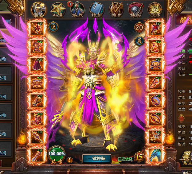 【佩戴全套金色装备后,可激活翅膀效果及战斗部分特效;】