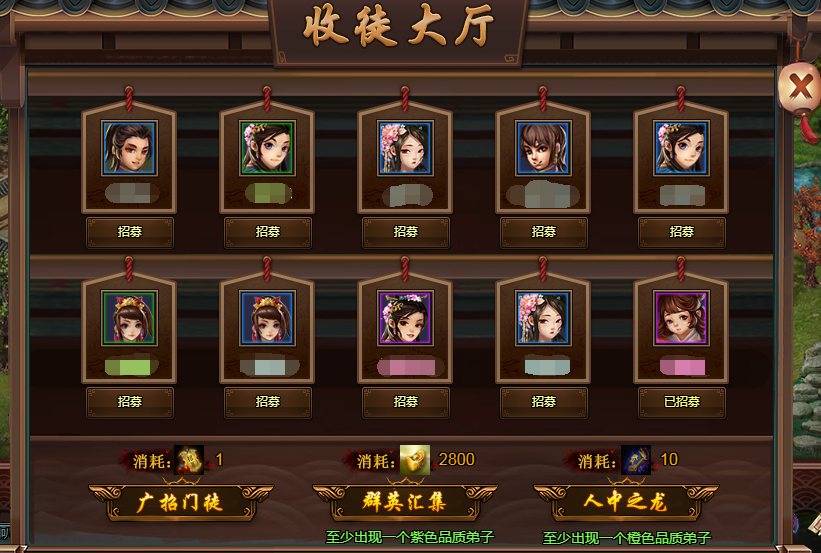 3、收徒大厅中可以招募弟子;(招募的弟子品质越高,拥有的初始属性越高,培养后的属性上限越高!)