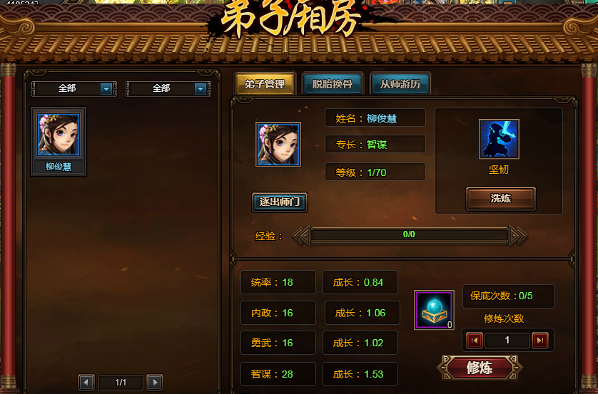 4、弟子厢房中可对弟子进行培养洗练;弟子从师游历师后可以增加对应师傅属性;