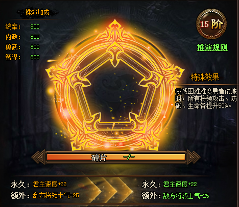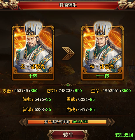 《热血三国3》10月20日版本更新公告 亲爱的玩家: 《热血三国3》所有区服将于10月20日14:00-16:30进行停服更新,本次更新内容如下: 内容新增: 1. 提升君主/将领转生上限至十五转以及显示特效。 1)10转后添加四维属性加成(助您战力飞升) 2)新增相应头像和面板特效 2. 天禄阁-推演10阶后新增阶段属性加成同时永久生效,无需激活单一阵图。 1) 两仪阴阳阵图新增--闪避属性 2) 三才化生阵图新增—暴击/韧性属性 3) 四象轮回阵图新增—攻击/防御/生命属性 4) 五行归一阵图新增—统帅/勇武/内政/智谋属性 3. 开启王者召回活动,赶快联系小伙伴一起体验全新版本吧! 4.开启热血庆典活动 1)即将开启【玉玺争夺战】&【杯酒论英雄】相关活动奖励等你来拿 2)即将开启【热血嘉年华】活动,各日常途径获取热血庆典碎片,集碎片换取海量道具福利 3)即将开启【以旧换新】活动,多余道具可以变废为宝了 4)即将开启【庆典回馈】活动,精英副本经验翻倍,更多奖励限时加入 调整优化: 1.调整过关斩将、一夫当关、千军破全通关奖励内容(加入相应阵图碎片)! 2.开启下扬州活动。 3.荣耀殿堂新增君主/将领转生固定积分项。 阵图推演效果预览