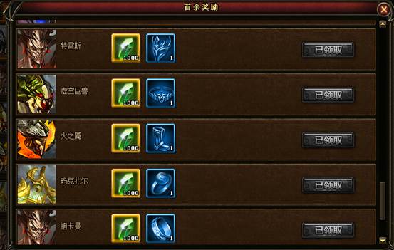 首次参与击杀boss后可以在右下角首杀奖励中领取对应boss的首次击杀奖励,奖励仅可获取一次