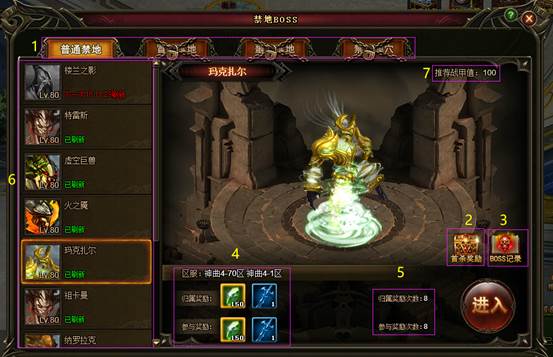 禁地boss为跨服玩法,每周一会进行一次分组匹配,玩家二转后通过王权之路副本挑战第一关,即可解锁禁地boss,每日8:00-24:00可以开放进入禁地禁地boss可以获得忒休斯战甲装备部件以及波塞冬宝石,主界面分为7个部分: