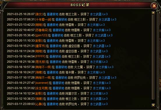 BOSS记录中将会记录归属奖励中掉落了武器和衣服两个部位的玩家和boss信息